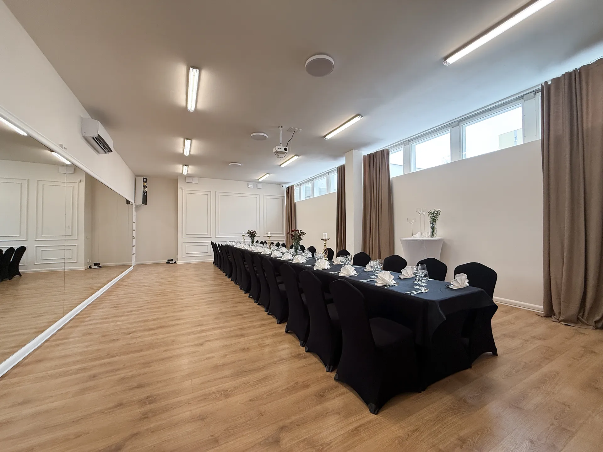 Wnętrza naszej sali są nowoczesne i stylowe. Przestronny hol (30 m²) i sala główna (70 m²) to idealne tło do zdjęć na Instagrama czy nagrywania TikToków. Możesz udekorować przestrzeń w dowolnym stylu – od neonowych klimatów po elegancki glamour. Twoja wizja, Twoje foty!